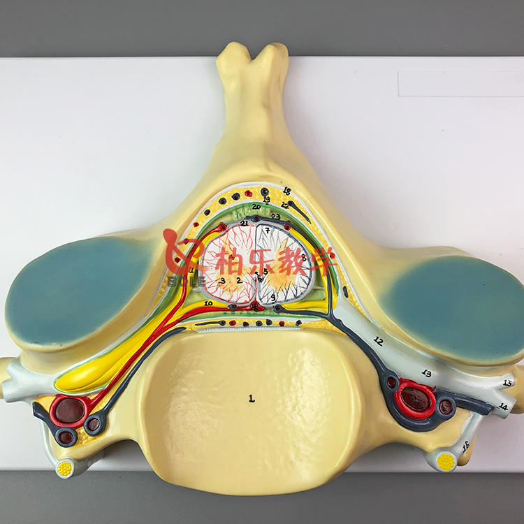 ■ 该模型显示第五颈椎、椎动脉、椎静脉与脊髓的横切面以及脊神经组成、硬脊膜、蛛网膜下隙等结构,共有40个部位指示标志。